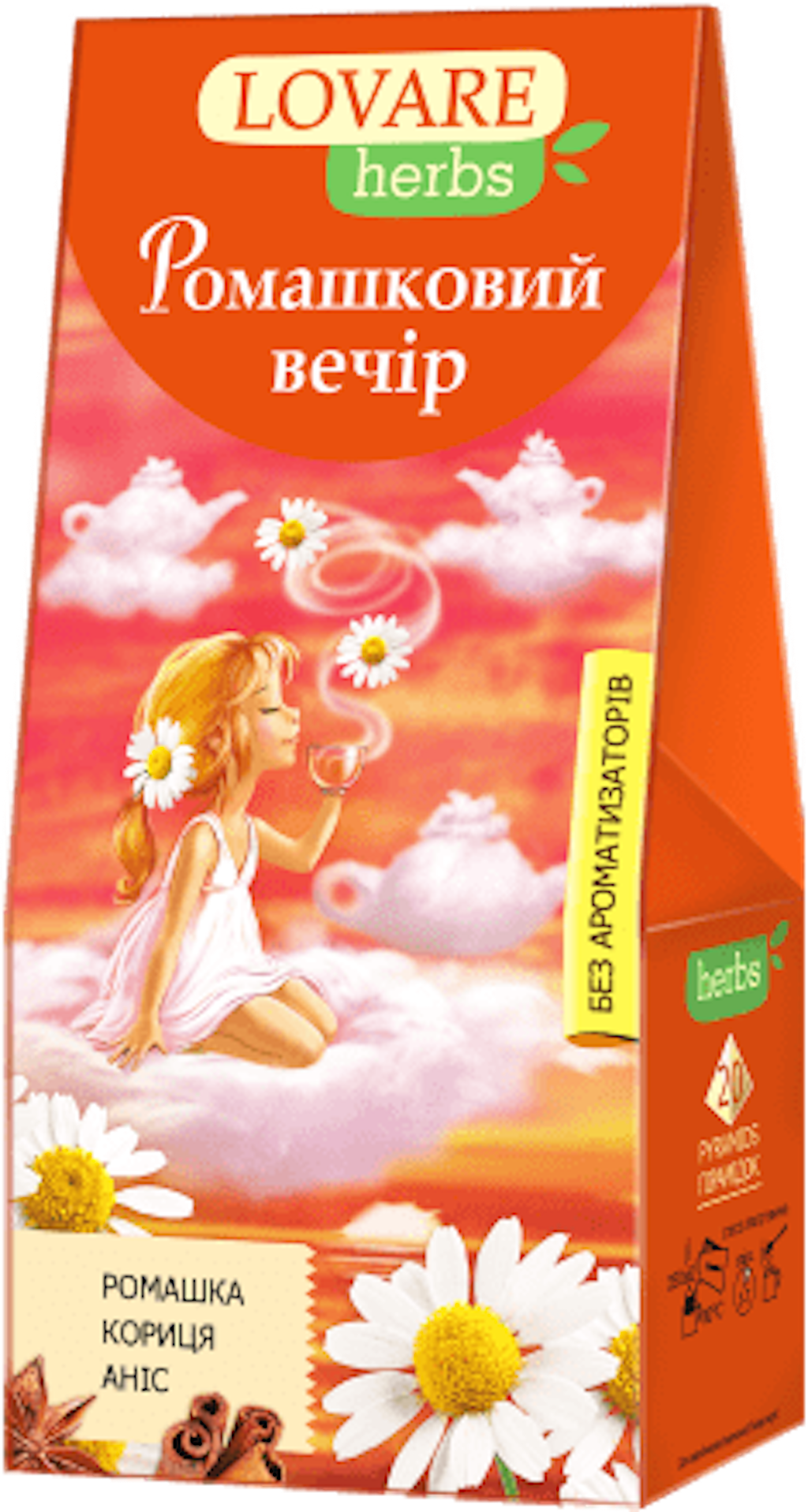 Hackade kamomillblommor (70%), kanel (15%), anisfrö (15%)
