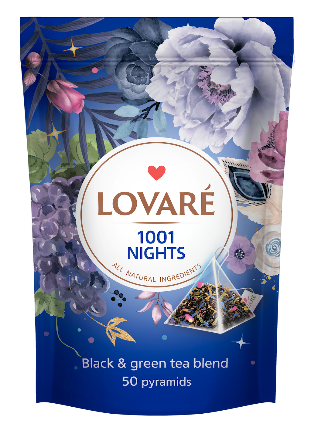 Ceylon svart lösbladste, kinesiskt grönt lösbladste Sencha (12%), kronblad (safflor, kinesisk ros, ringblomma och blåklint) (1.8%), naturlig druvarom.