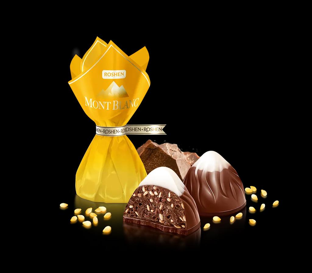 Pralinékonfekt ”Mont Blanc” med choklad och sesam.